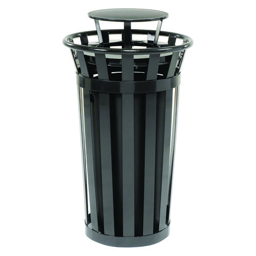 Outdoor Slatted Steel Trash Can, Rain Bonnet Lid, 24 gal, Black