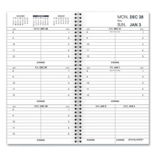 This weekly Appointment Book Planner refill will help you plan out each week in detail. It allows for easy event planning 12 months from January to December. High-quality paper features superior ink bleed resistance One week per two-page spread with hourly appointments from 8AM to 5PM Monday to Friday for comprehensive scheduling. Saturday and Sunday are split on the right hand page and are untimed for leisurely planning. Past, current and future month reference on each two-page spread for long term planning Wirebound refill pages stay secure in your Appointment Book Planner. 3.25" x 6.25" page size. Refill only. Compatible with AT-A-GLANCE Refillable Weekly Appointment Book Planner (sold separately).