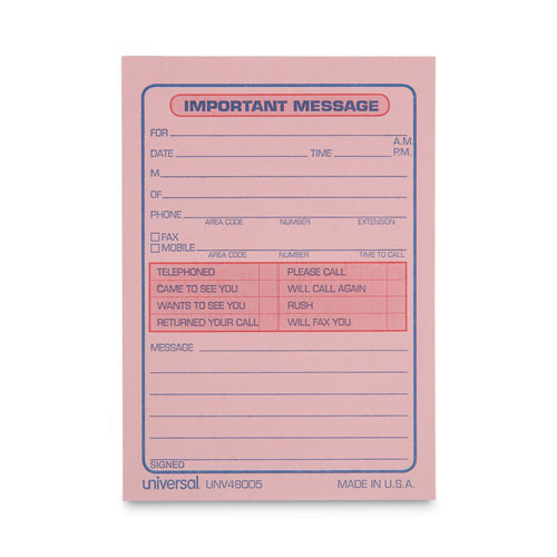 Universal® Wirebound Message Books are great for taking messages and keeping track of calls while you're out or on another call. Helpful labeled form prompts the administrative assistant to gather all the important details of each call. The original copy is written on white paper, which is perforated so each message can be torn out individually. Black-print carbonless duplicates are printed on the yellow paper that remain in the book for keeping records. Comes with a stop card to prevent write-through.